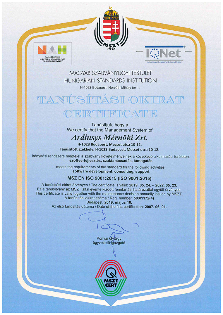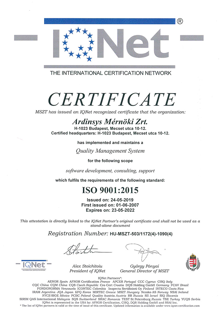 Cégünk, az ARDINSYS Zrt. már 1998 óta követi az ISO minőségirányítási rendszerek folyamatszemléletét, módszertani útmutatásait és teljesíti azok követelményeit. Minőségcéljaink elérése érdekében az ARDINSYS Zrt. jelenleg az MSZ ISO 9001:2015 minőségirányítási szabványnak megfelelően működik. Cégünk működését a Magyar Szabványügyi Testület (MSZT) – az IQNet magyarországi partnere – folyamatosan auditálja (tanúsítvány regisztrációs száma: HU-MSZT-503/1172(5)-1090(5)).